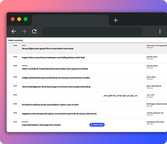 AFP's text services are punctuated by regular publications of forecast agendas and editorial notes, allowing you to anticipate news coverage. Regional agendas list the major events of the next day, week and month.